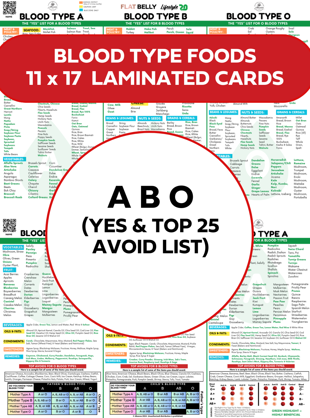 The yes list for Blood Types A B & O available on one 11 x 17 laminated card.